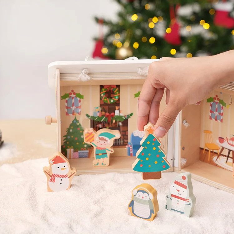 The set includes a wooden dollhouse and 7 festive figures such as penguins, trees, and holiday decorations.